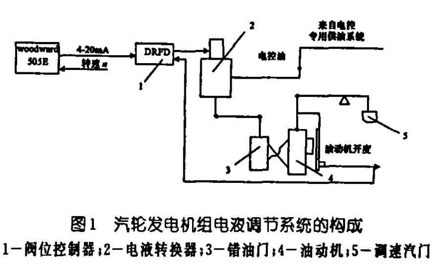 7号25MW汽轮发电机组电液调节系统的基本构成和工作原理 电液调节系统的基本构成见图 1。 在汽轮机前轴承箱 内装有 2个测转速探头,将检测到的转速信号输入到woodward505E与设定值进行比较,如果有偏差WOODWARD 505E就会输出4~20mA的电流信号至DRFD阀位控制器,阀位控制器输出士250mA的电流信号到SVA9型电液转换器,使电液转换器滑阀产生位移,借助与电控油站提供的压力油作用与中间的杠杆机构,带动错油门滑阀通过油动机改变调速汽门的开度,消除转速偏差, 使转速保持在额定的工作转速。